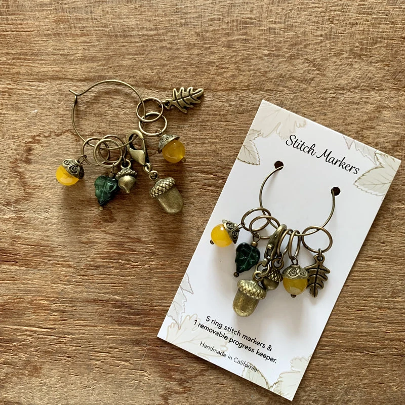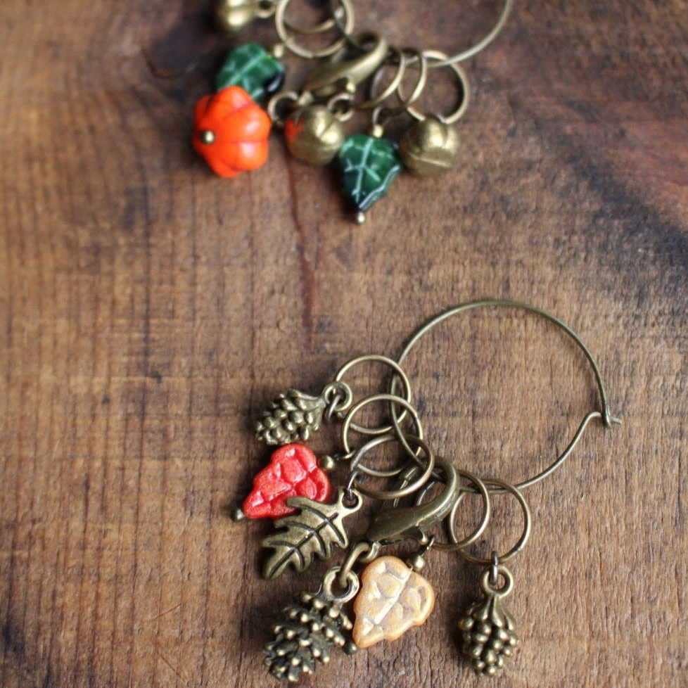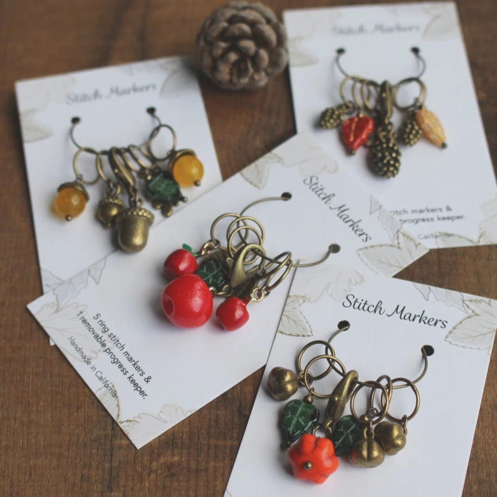 From apples and acorns to pumpkins and pinecones, these charming sets perfectly represent the fall season. Autumn Harvest stitch markers are made by hand in California with Czech glass beads along with enameled, resin, and antique bronze charms. Each set consists of 5 ring stitch markers that fit up to a US10/6mm needle and 1 removable progress keeper.