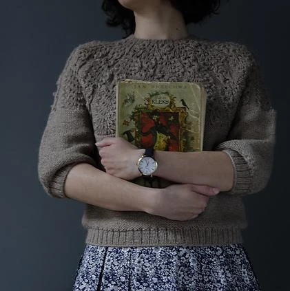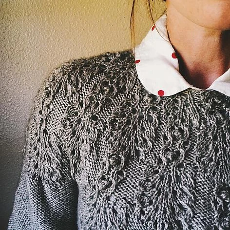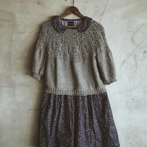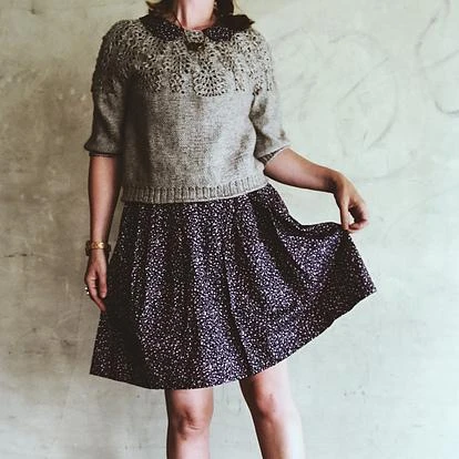 Whitehorse features a lace yoke pattern and is designed to hit at the natural waist and elbows with a slightly oversized fit. The lace yoke is knitted first, and then you switch to knitting inside out for the body and sleeves.