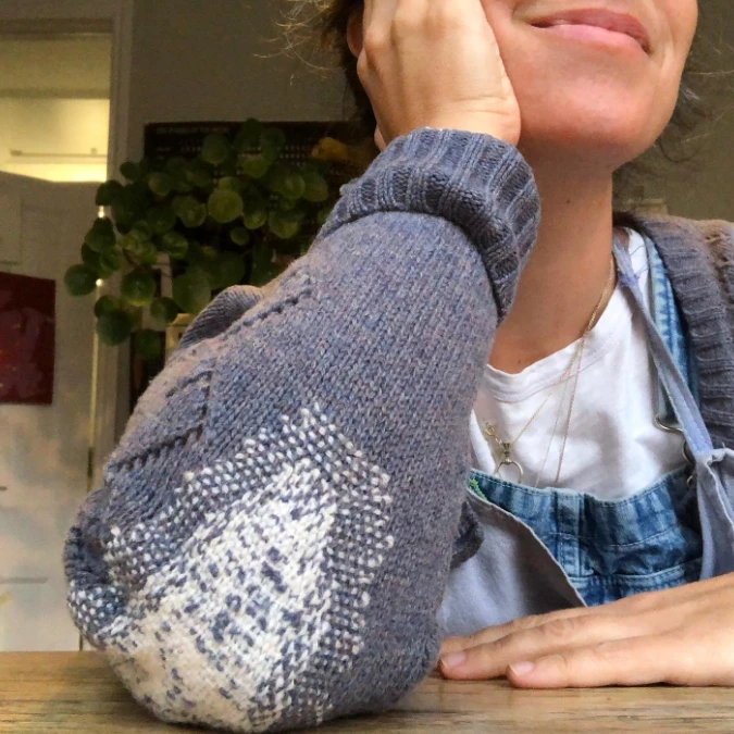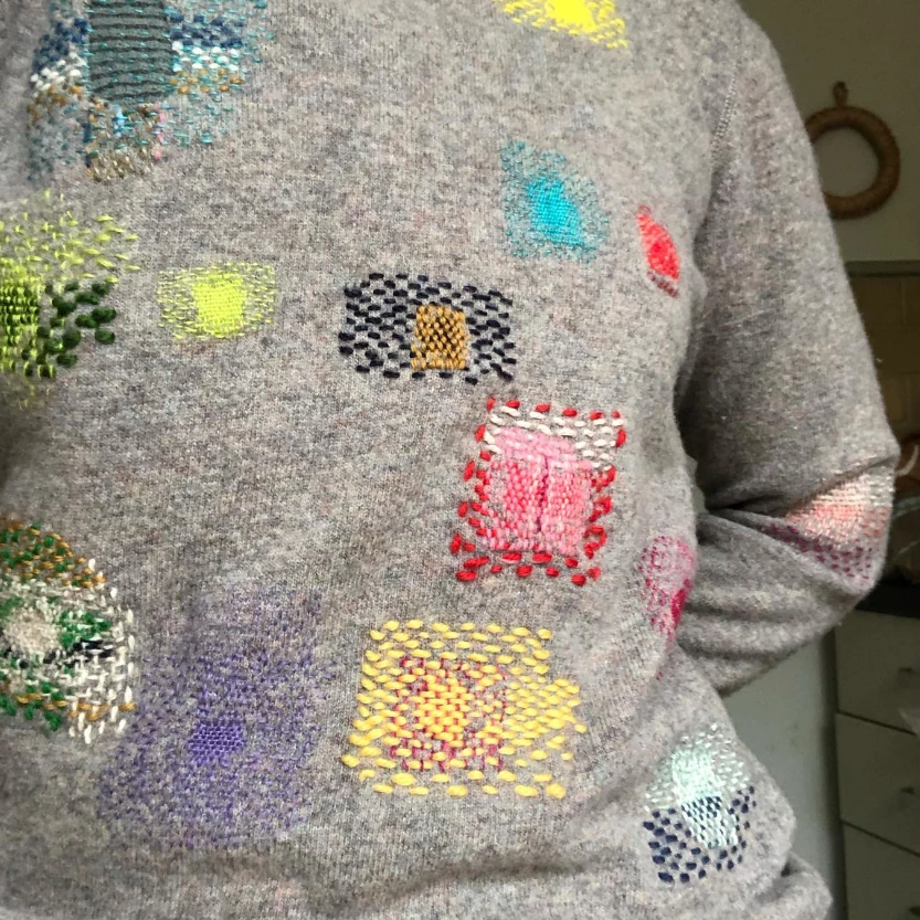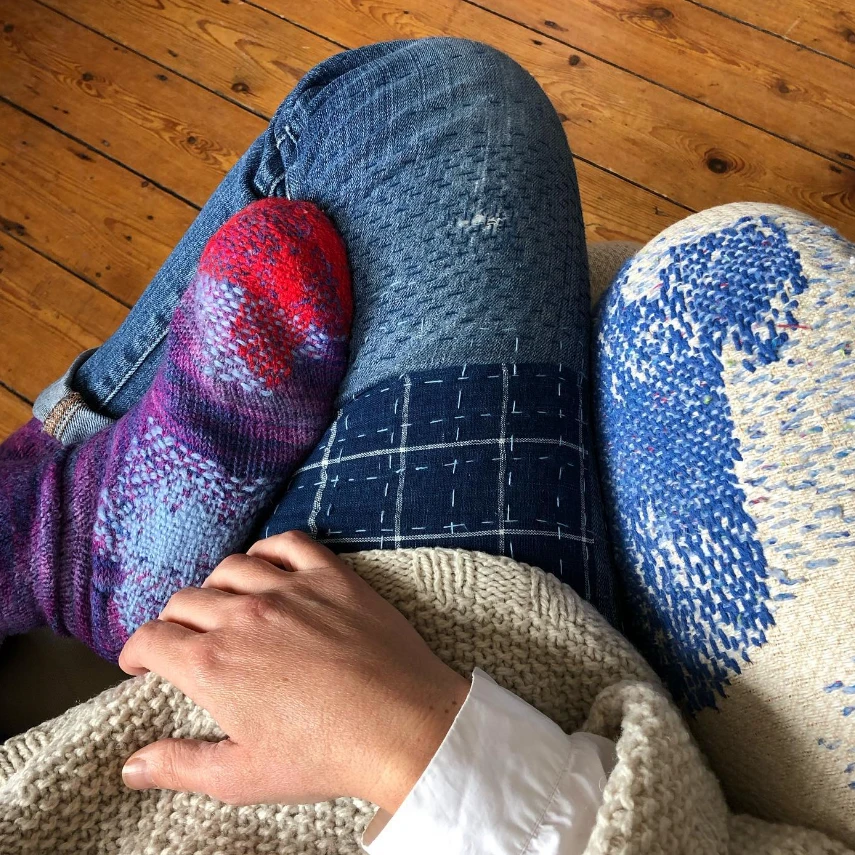 Celia Pym has been exploring mending since 2007 with extensive experience of small, everyday holes, at heels, elbows, in pockets as well as working on more dramatic damage, from water damage, animal nesting, and moths issues. Celia’s interests are around the evidence of damage – through repair you look closely at where garments and cloth have got worn down and thin. In clothing, this wearing is often to do with use and how the body moves. Celia says “she likes that darning is often small acts of care and paying attention to where things fray and wear out.”