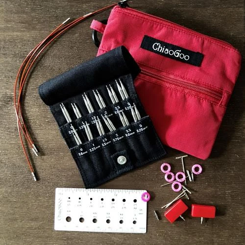 • End stoppers, stitch markers, a mini needle gauge and tightening keys