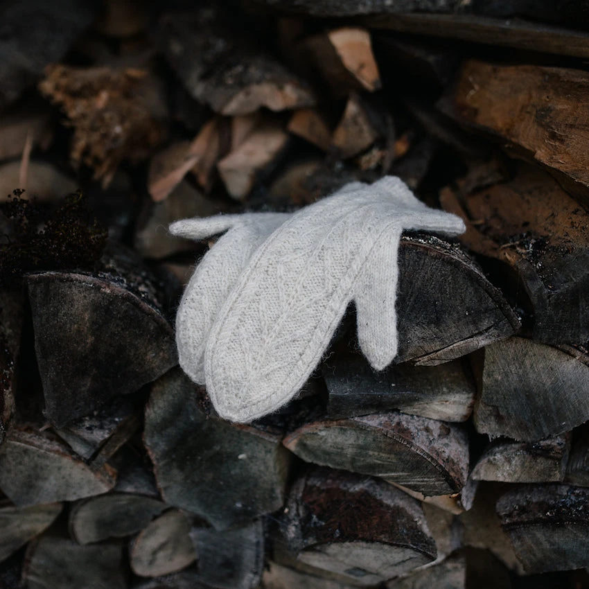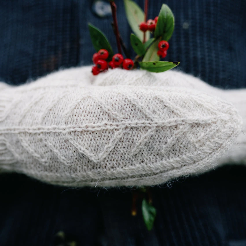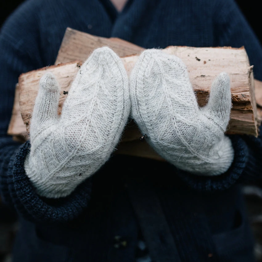 Rachel Atkinson’s mittens are close-fitting, with long cuffs for tucking into coat sleeves. The beautiful cabling gives the mittens an understated elegance.