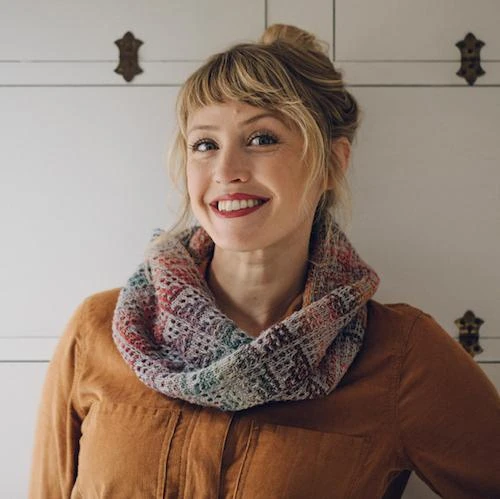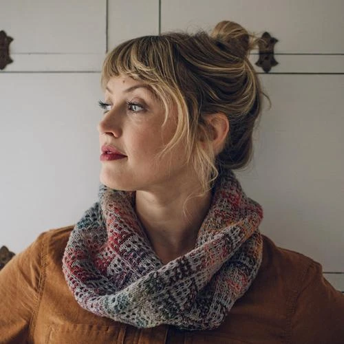 “If I were to pick my favorite cowl style, it is definitely the Moebius cowl. It is perfect for colorwork projects because the floats are hidden inside, and it is so easy to style. Just pop it on to finish any outfit! The Montana Mountain Cowl uses the Mosaic method to add color and texture to this engaging knit!”