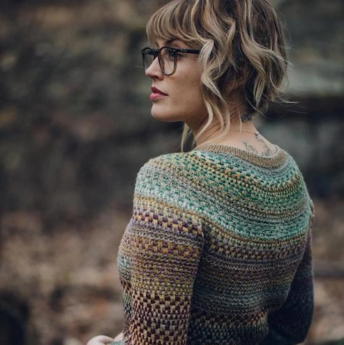 This sweater is all about being playful and having fun with color! One colorway is used consistently as the “background” while 3 contrasting colors make up the textured colorwork using the Mosaic knitting method! This is one of the most versatile pieces in my wardrobe – it looks fabulous with high waisted pants and skirts, layered under overalls and pinafores or over dresses and tunics!