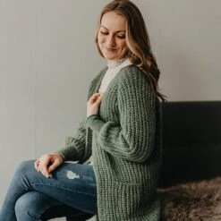 The cardigan is knit from the top down and back and forth on a circular needle. At the beginning only one number is given (for all sizes), but as the work grows, separate numbers are given for all sizes. The pattern gives directions for both a square neckline and a v-neck.