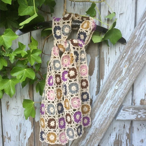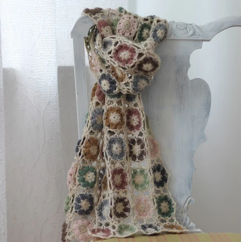 The scarf made with Yaku consists of flowers crocheted in 6 different colors and a 7th color around the edge.
