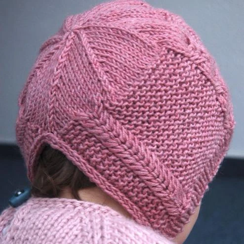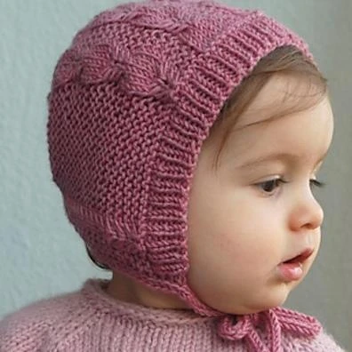This bonnet is knit seamlessly and features an easy cable pattern on a garter stitch background. The front of the bonnet is knit flat; the crown is knit in the round. An attached I-cord and I-cord ties are worked on the neck portion. Both charts and written instructions are provided to accommodate personal preference.
