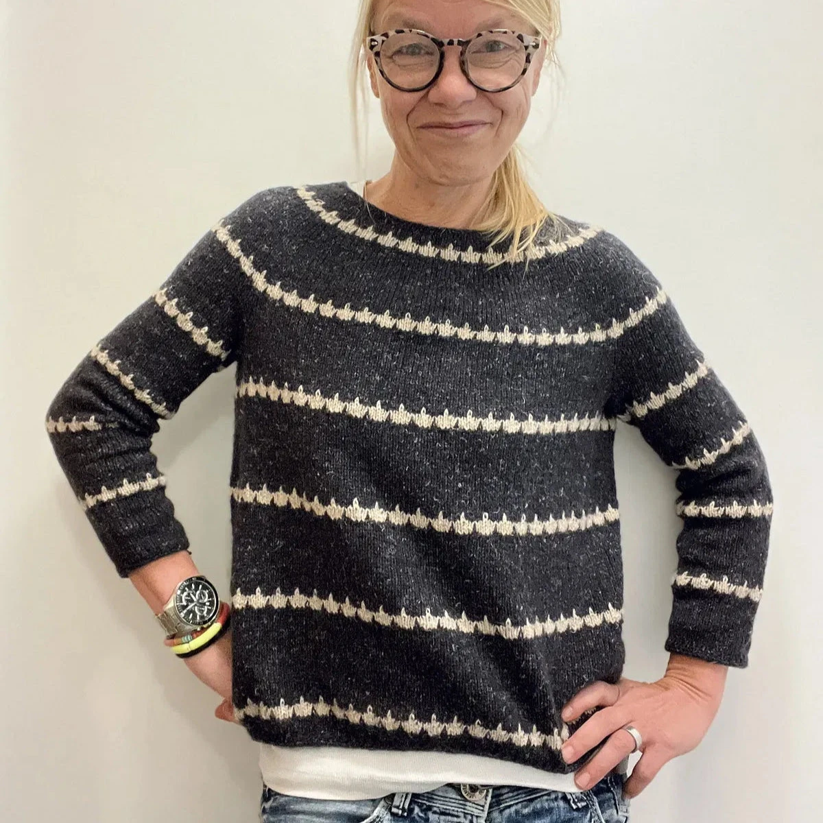 The Heimathafen Pullover blends classic maritime style with a modern touch, featuring a stunning allover “dip stitch colourwork” stripe pattern. Designed for both beauty and comfort, this top-down knit begins with neck shaping and short rows, ensuring a higher back neckline for a perfect fit. The round yoke construction is accentuated by bold stripes and raglan increases, while the seamless sleeves flow effortlessly to the cuffs. With no finishing required, this pullover is a delight to knit and an essential everyday staple.