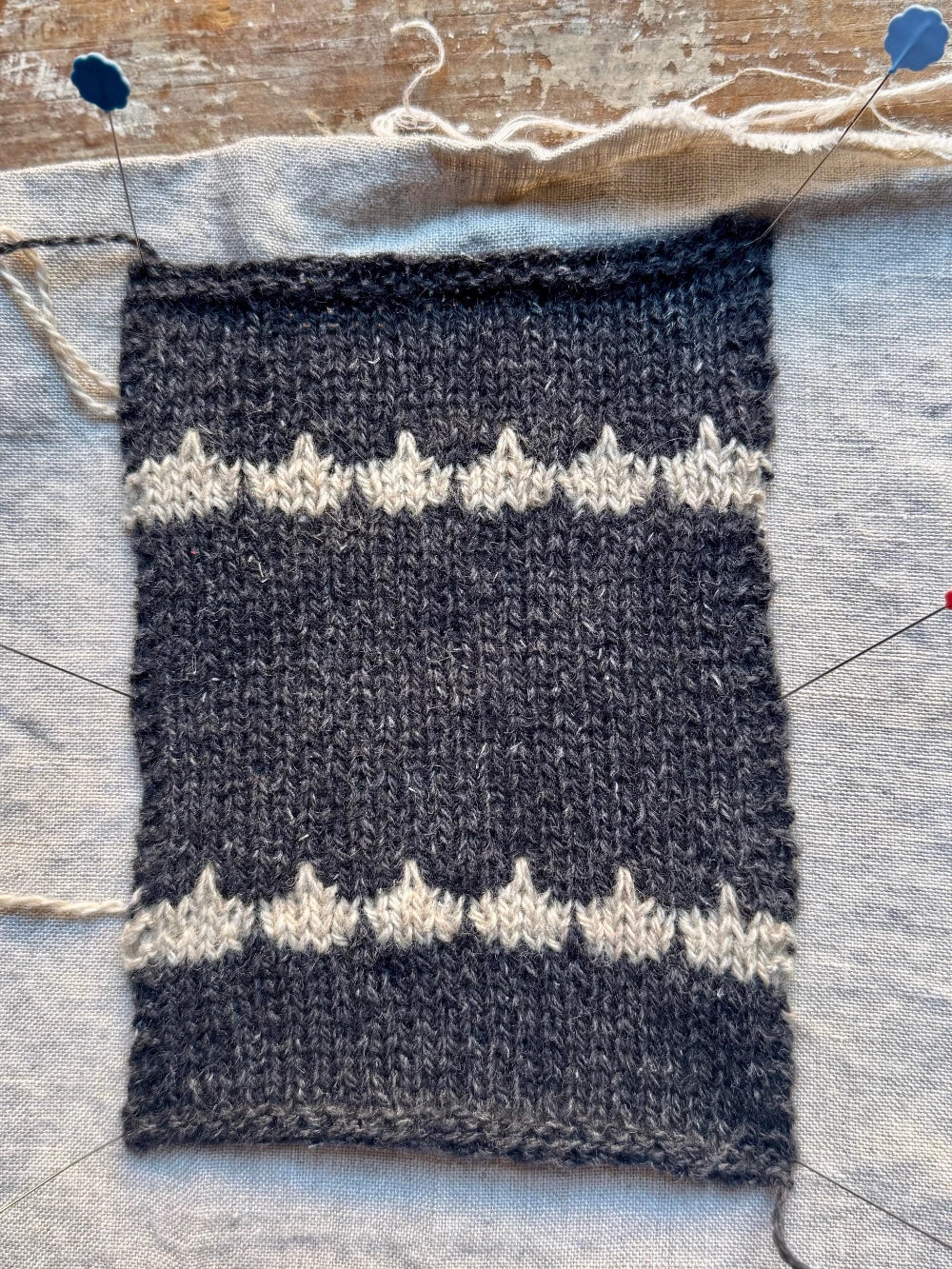 US 3 (3.25 mm) 16” (40 cm) and 32” (80 cm) circular needle and DPNs (or longer circular needle for magic loop) for body and sleeves.