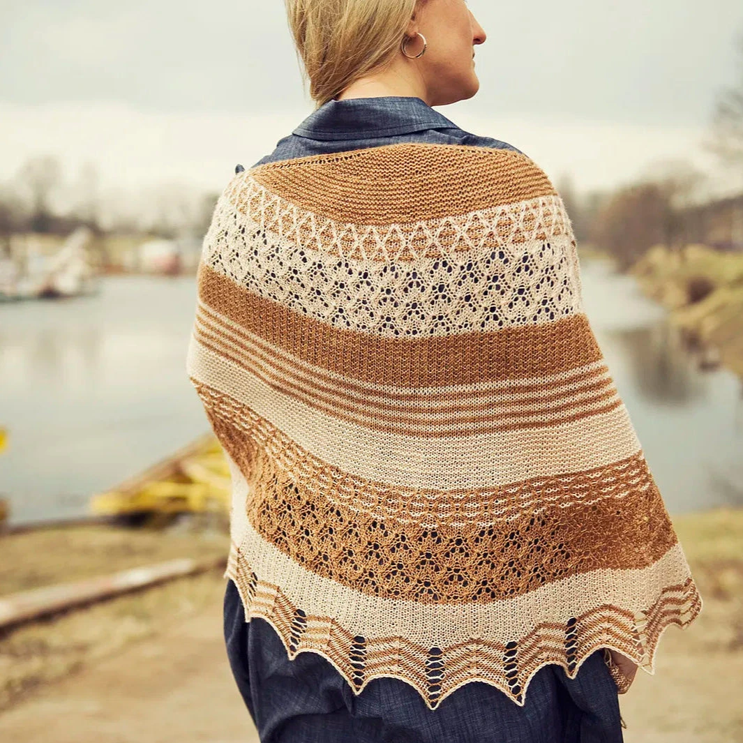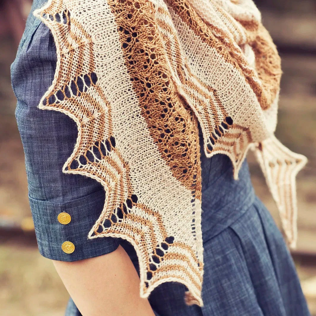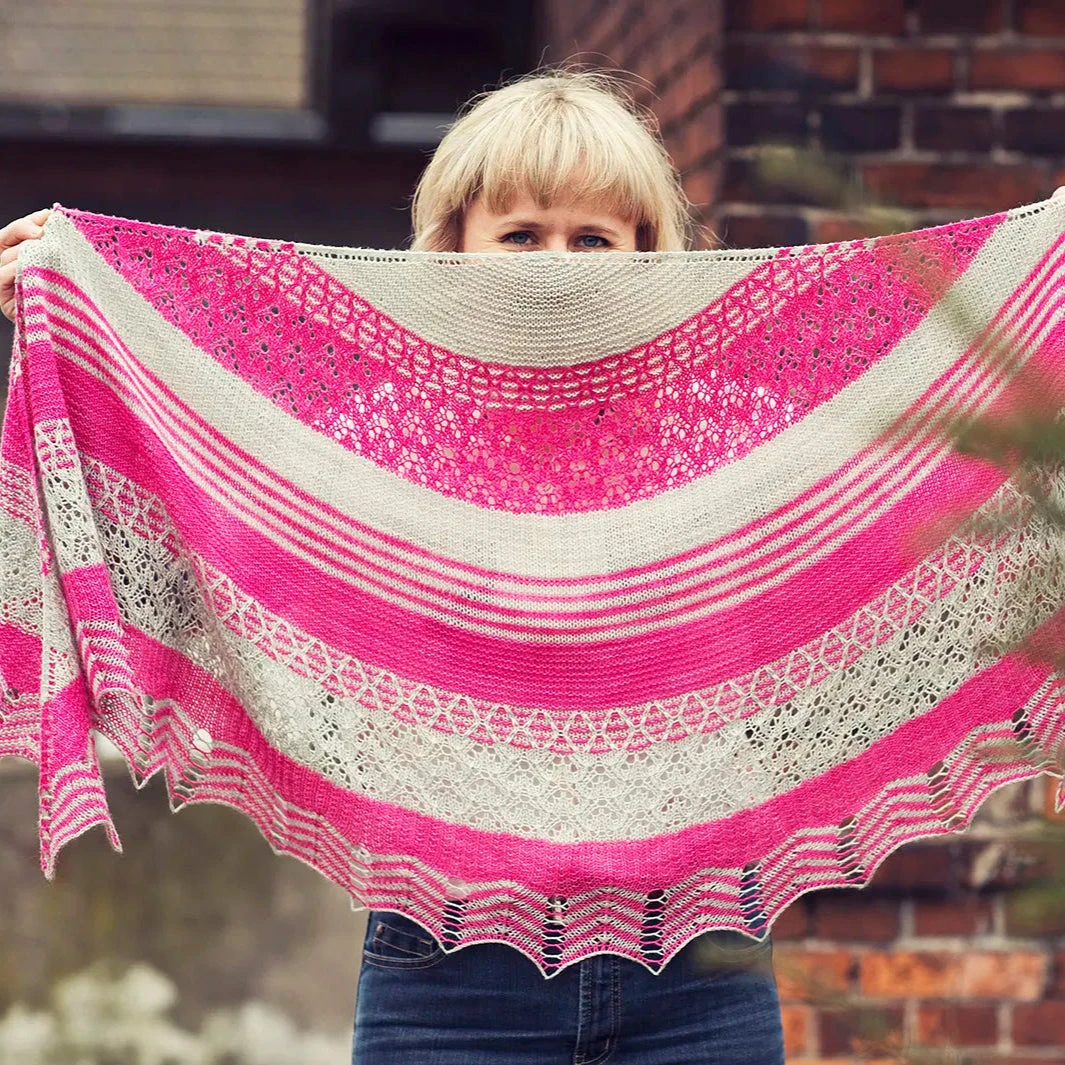 Holyrood shawl begins at the center and is worked outwards to the border. It is worked in sections with various stitch patterns from garter stitch, through stripes to lace. The sample shawls are each worked in two contrasting colors but would look equally beautiful when knit in a variety of them – just look for leftovers and have fun mixing them.
