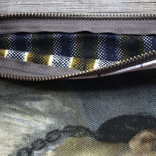 Silkscreened and stitched with a zipper and rawhide zipper-pull.Â