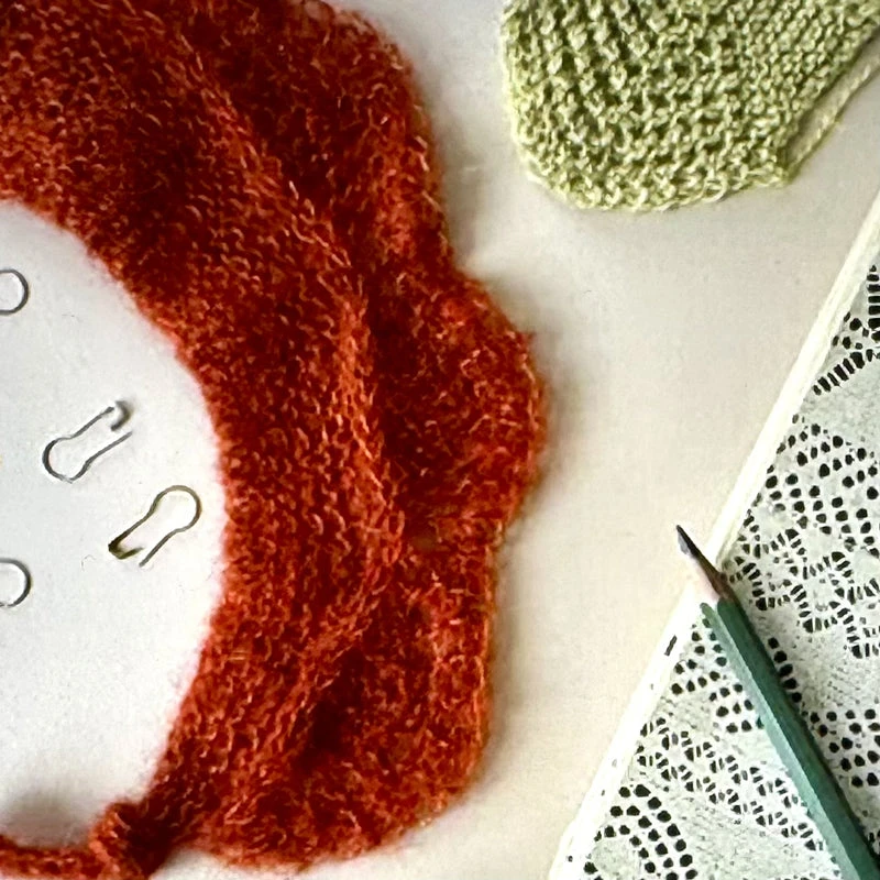First the ’body’ of the scarf is knitted, working back and forth with short rows. Then stitches are bound off at the beginning of the scarf for the first knot, then a lace edge is knitted sideways onto the scarf so that the last stitch of the lace edge is knitted together with a stitch from the ’body’ of the scarf on every right-side row. At the end, stitches are bound off at the end of the scarf for the second knot.