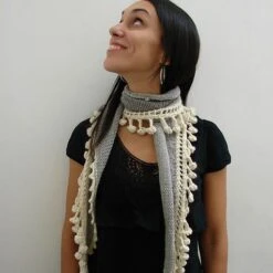 – You can use any worsted yarn that knits up to gauge. The sample used: Fringe: Malabrigo Yarn Merino Worsted (100g /200y) – 1 skein in natural – Yarn color A. Body of the scarf: Abuelita Yarns Merino Worsted (100g/200y) – 1 skein in heathered gray – Yarn color B