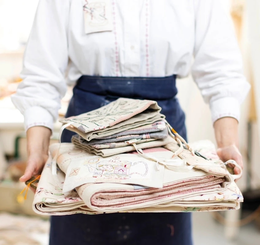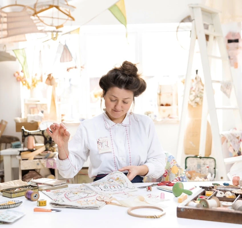 Jessie Chorley is a London-based textile artist. Traditional hand embroidery, patchwork techniques and printmaking are at the heart of Jessie’s practice as an artist-maker. Needle and thread are her drawing tools, she uses them to create scenes and stories, combining stitched images and words, largely on preloved fabric. Collecting is something that goes hand-in-hand with Jessie’s making process.