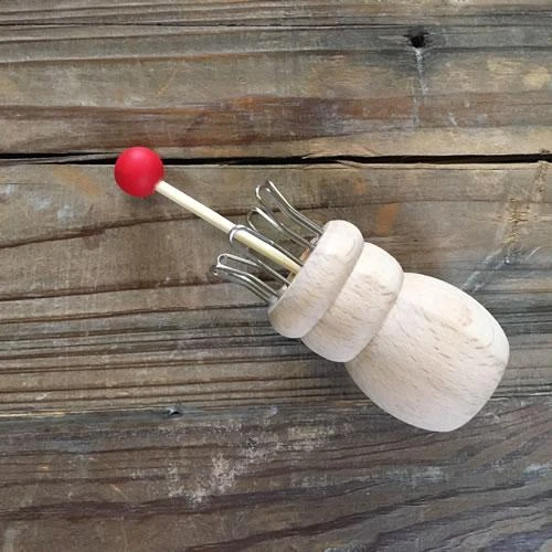 This wooden knitting doll , creates a form of knitting that uses a spool with a number of pegs around the rim to produce a narrow tube of fabric, similar to i-cord . Spool knitting is a traditional way to teach children the basic principles of knitting.