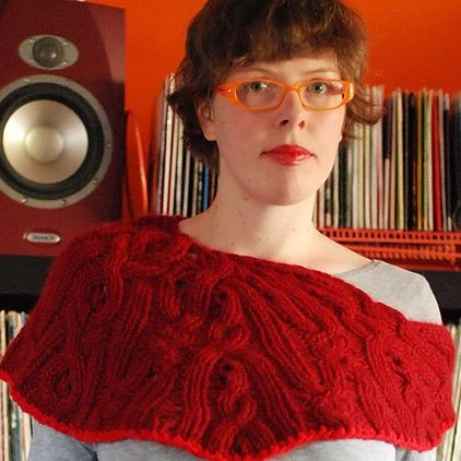 This pattern is for any weight yarn! This cabled shawl design is worked outwards, starting at the top center, with increases bringing it out into a curved U-shape, and can be worked either until it’s just the size you want, or until you run out of yarn. The bind-off can come at any row, and can be worked in a different colored yarn, both for a contrasting edge design feature, and to help every last bit of yarn get used up.