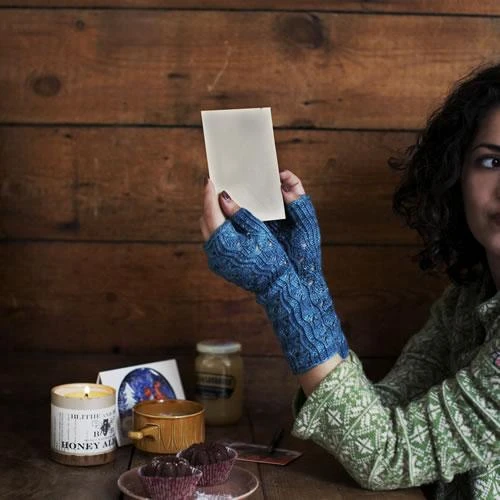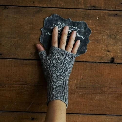 This pattern has it all ~ lace, twisted stitches and ribbing. It stretches and contracts beautifully to give a well ~ fitted fingerless mitten with wrist ~ narrowing appeal while the wavy lines work to elongate the arm. It looks best in subtle semi ~ solid, hand ~ paint yarns such as Handmaiden Casbah or luxurious madelinetosh Pashmina.