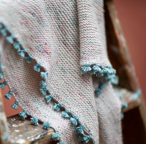 This is the sweetest pattern that is fun and very easy to make. It is a triangle shawlette shape with rows of very tiny tassels going along the two side edges. The colours are beautiful, and the result is a sweet and fun shawlette that’s easy to wear any time of year.