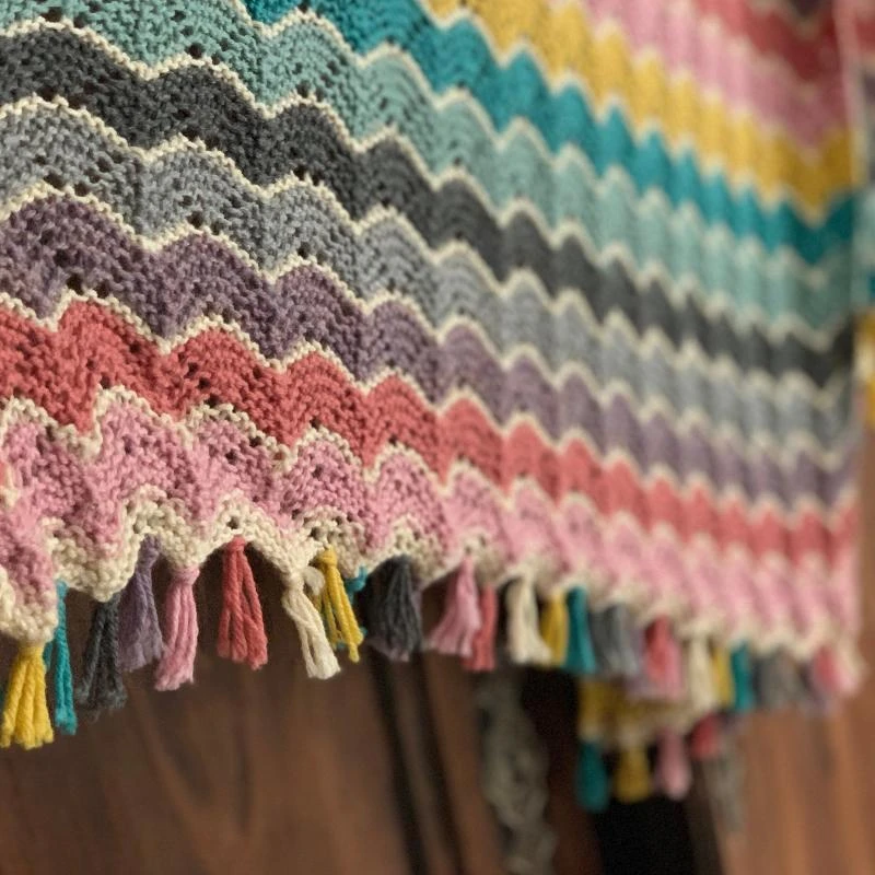 You have the option to customise the size of this blanket by adding extra repeats and utilising more or less yarn or colours. We’ve also added some cute tassels using leftover yarn for a playful touch.