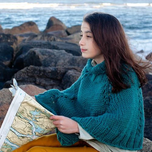 Our tailored and abbreviated version of the classic poncho. The decorative openwork of the increases, paired with chunky yarn, add a graphic detail. Great with jeans or dressed up with a flouncy skirt and mud boots. A simple project knit in the round from the top down. Great for any level knitter, and for anyone who wants to try something fresh and new.
