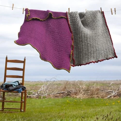 Each blanket has two versions, one worked in Burly Spun and one worked in Lamb’s Pride Bulky.