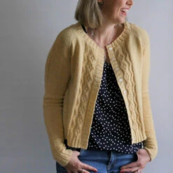 Classic style with modern fit – the Mae Cardigan features striking twisted stitch detail on the fronts and sleeves, with comfortable shaping for nearly any figure. It’s both dainty and rugged in a hearty fingering weight wool.