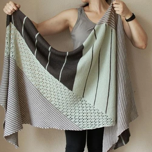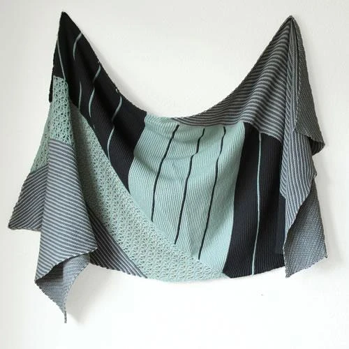 It’s a generous rectangular shawl knit from four different colors, using short rows to seamlessly combine textures like stripes and lace into a garment that captures the steep lines and beautiful color play of the Verdon Gorge itself.