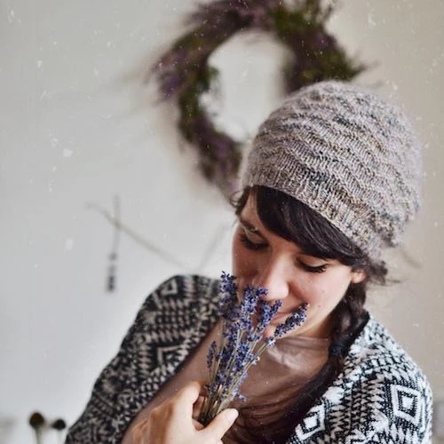 I have used one skein of La Bien Aimée Merino DK in the Secret garden colorway and one skein of their Mohair silk. Both yarns held together create the most beautiful and cozy fabric!