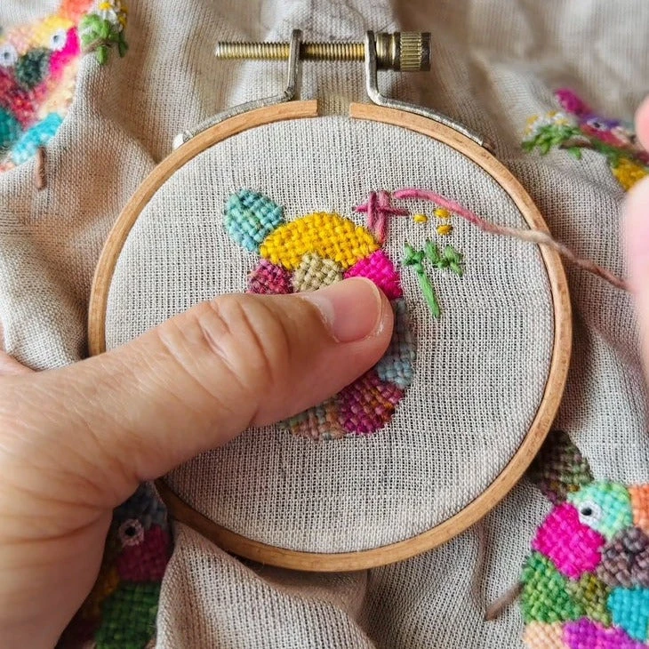 Exciting news: Visiting us from Japan, Tomomi Mimura is coming to London to teach her charming and gorgeous mosaic darning embroidery technique! If you adore her whimsical designs as much as we do, this is a class you won’t want to miss.
