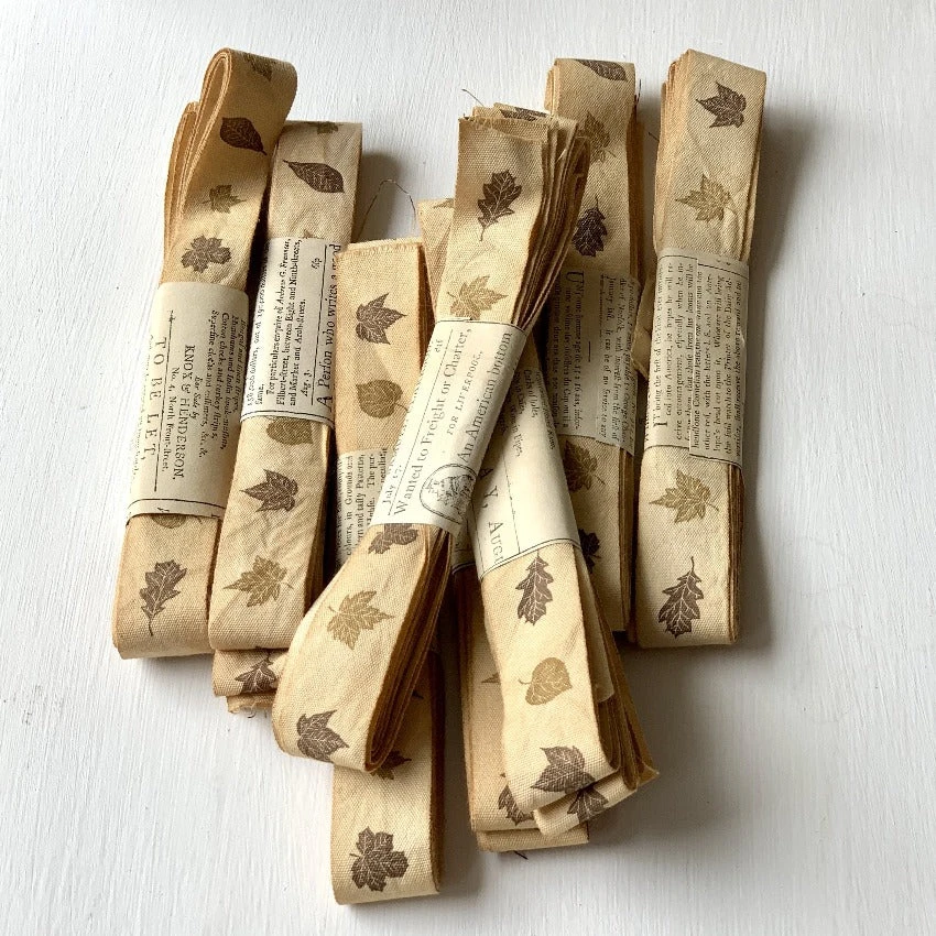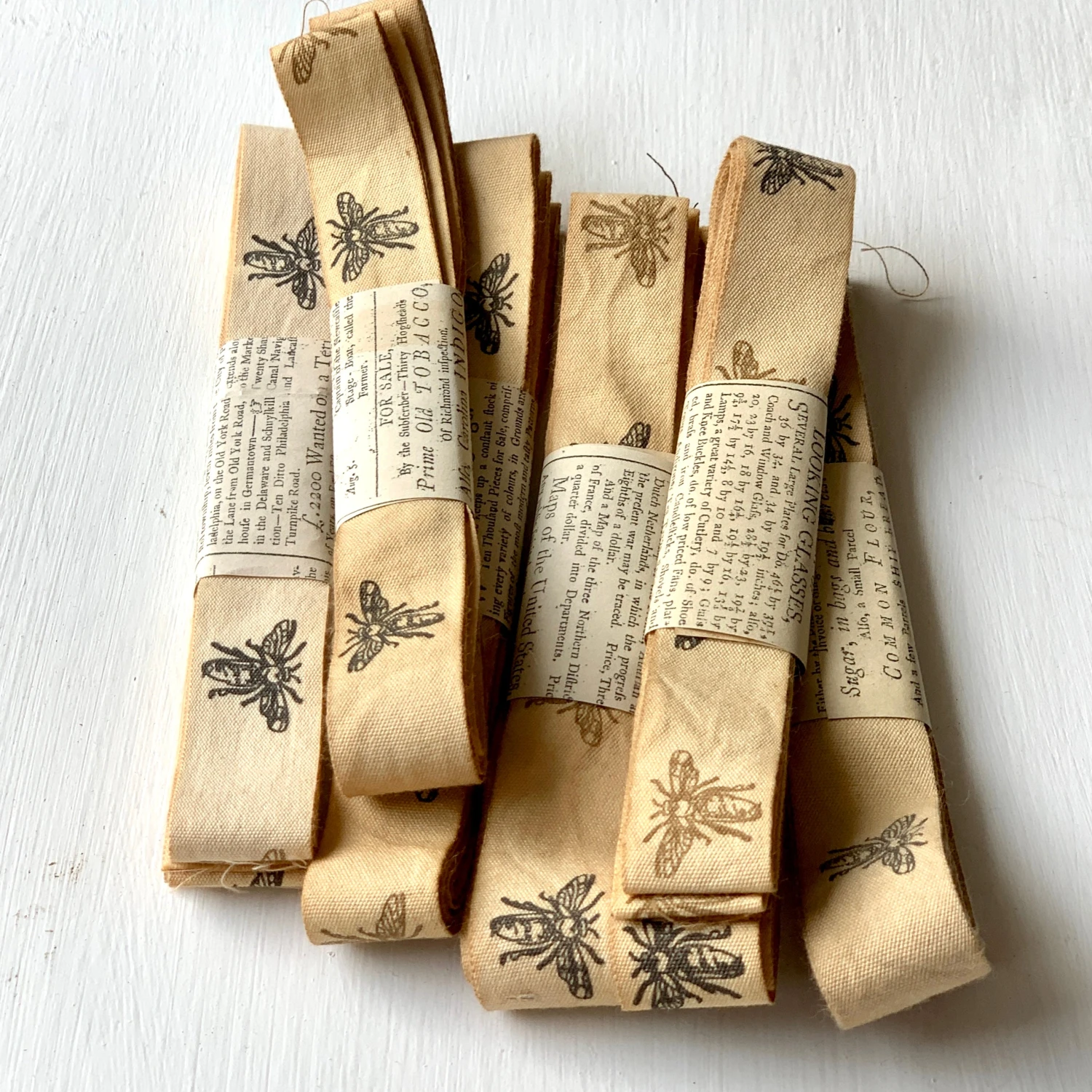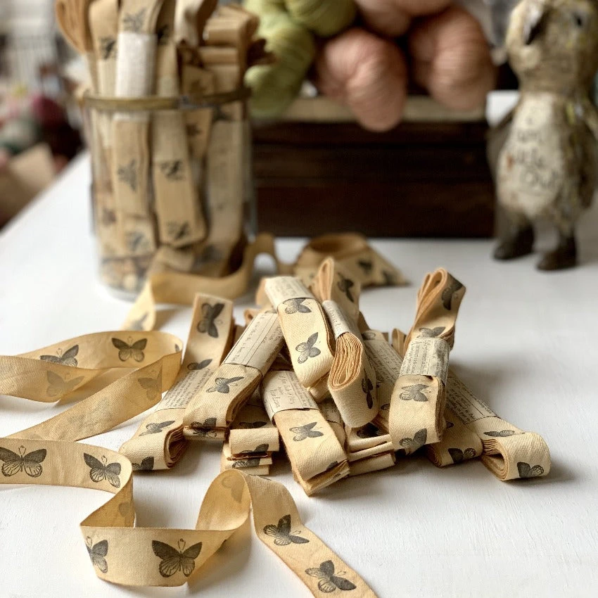 Beautiful hand printed ribbons in designs of bees, birds, leaves and butterflies.