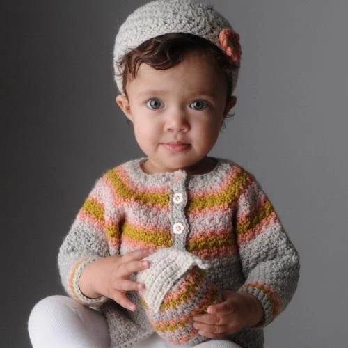 The texture of this lovely stitch pattern works particularly well with the coloured yoke. This is worked in the round form towp down so no seams.