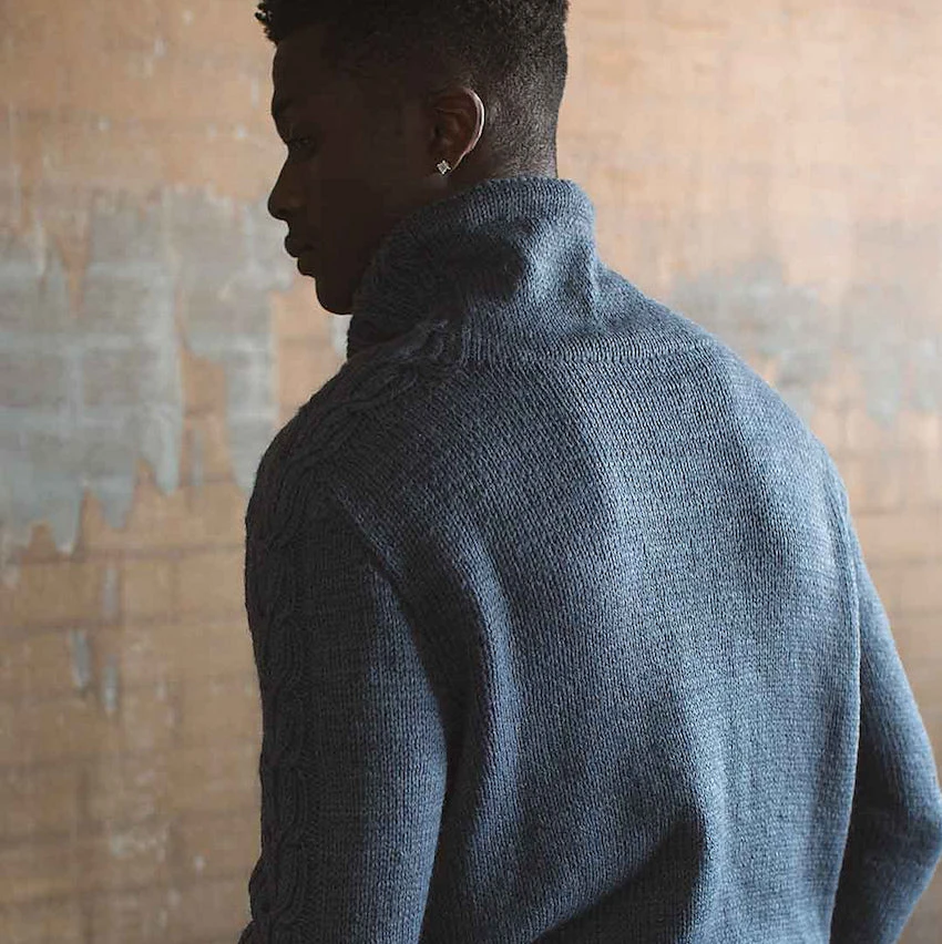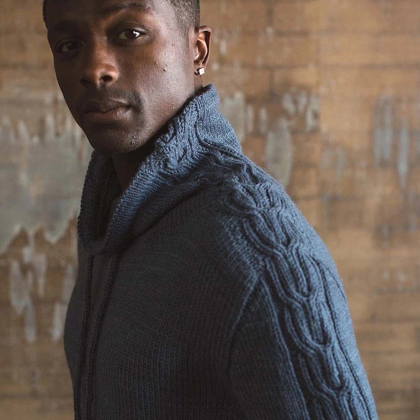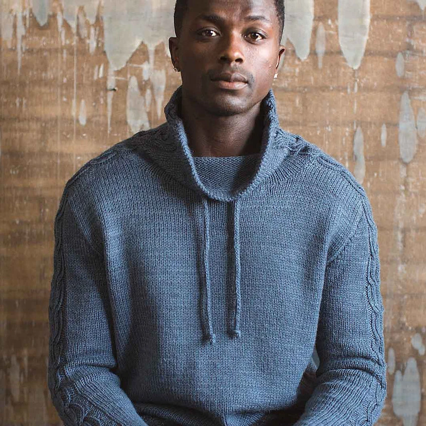 The Nelson Pullover is a modern knitter’s take on men’s athletic wear. This sporty, youthful pullover features a continuous cable that runs up the sleeve and shoulder into the cowl neck. The drawstring ties add charm as well as warmth in cold weather.