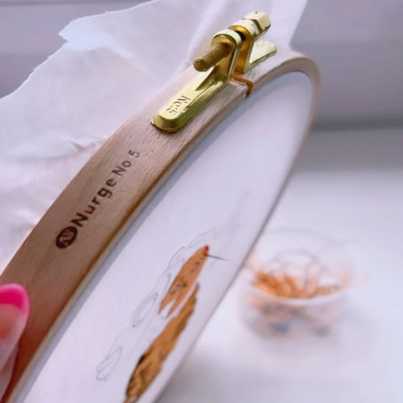 Experience the unparalleled quality of Nurge embroidery hoops, crafted from beautiful hard beech wood and meticulously sanded and polished by hand for a smooth and natural finish. Easily adjust your hoop with the brass screw for ultimate embroidery precision.