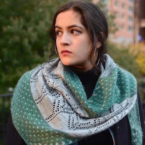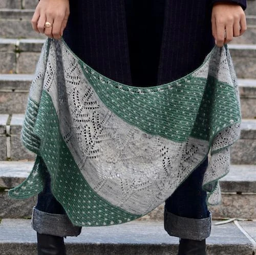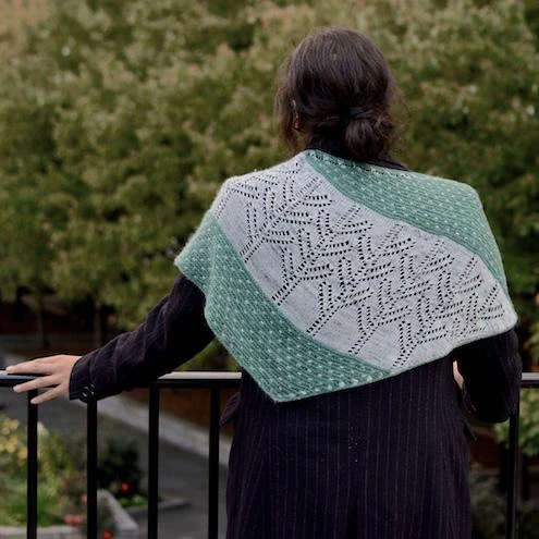 Olives in November is a curved, triangular shawl, worked from one narrow point outward. Alternating panels of slipped stitches and lace adorn the body of the shawl followed by a narrow, edging that is worked around all three sides.