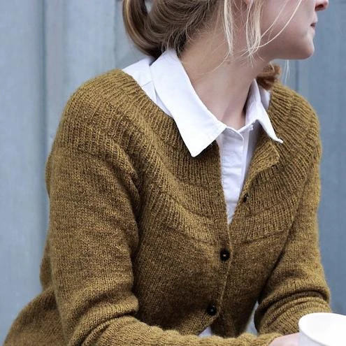 Anker’s Cardigan has a yoke consisting of segments of rib stitch followed by classic raglan increases. The cardigan is worked top-down, back and forth on long circular needles. The sleeves are worked in the round on double pointed needles or using the magic loop technique. The first and the last 7 sts on every row are worked in rib pattern and overlap to create the front bands. The edges of the sleeves and body are also knit in rib stitch.