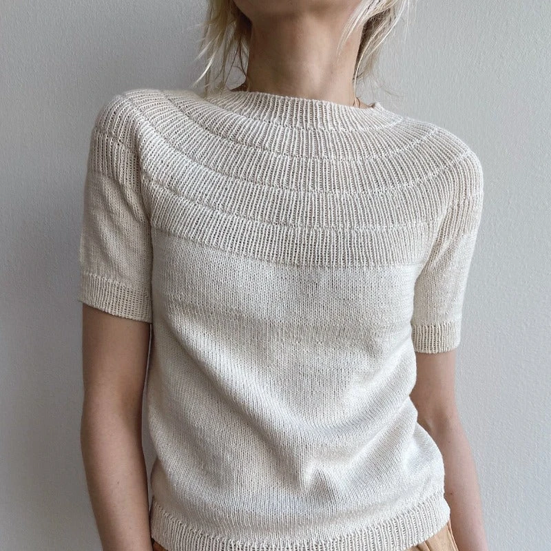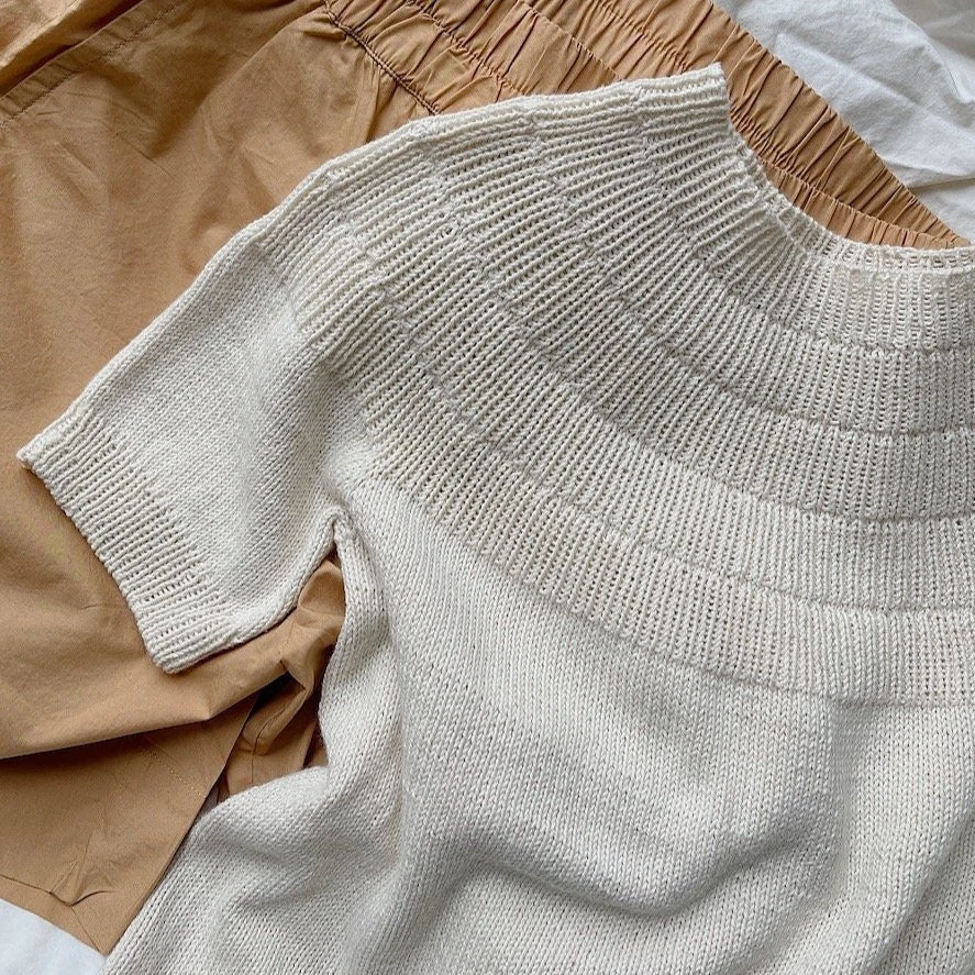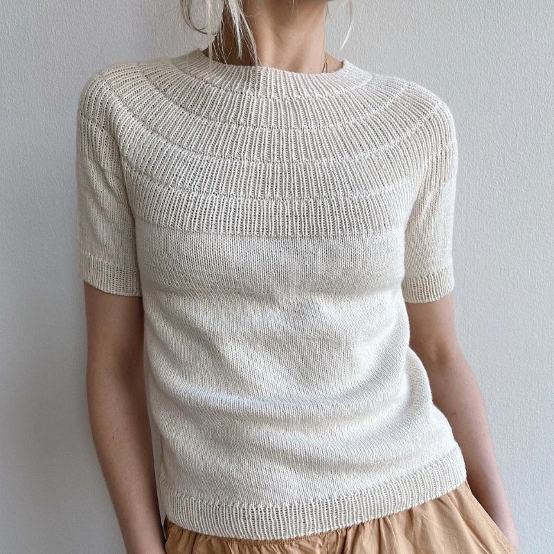 Anker Tee is worked from the top down. The yoke is worked in sections of rib with increases in the round, followed by classic raglan increases when the stockinette stitch section begins. The sleeves are worked at the end, either on double-pointed needles or on circular needles using the Magic Loop technique. Anker Tee has no finishing other than weaving in ends.