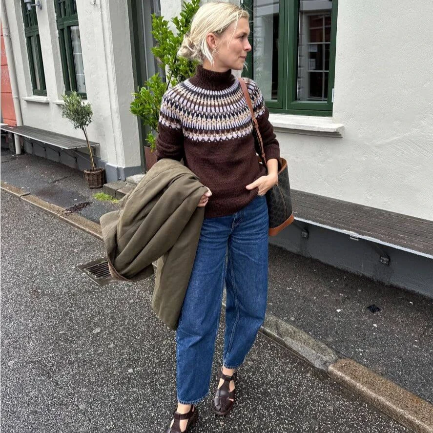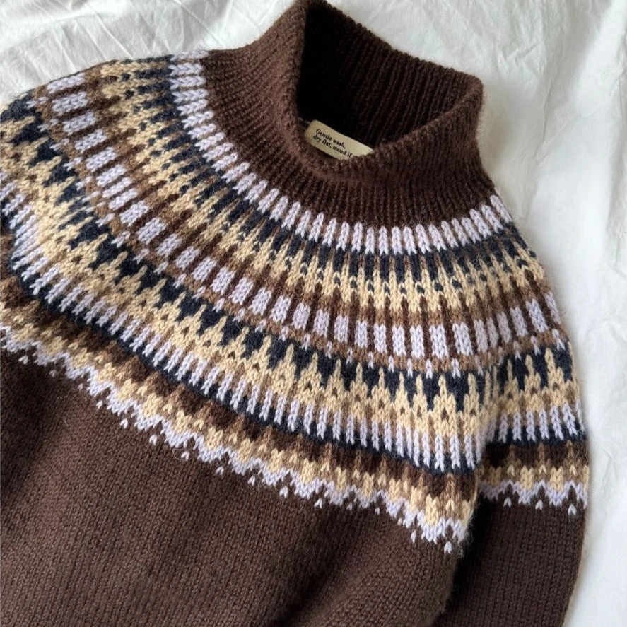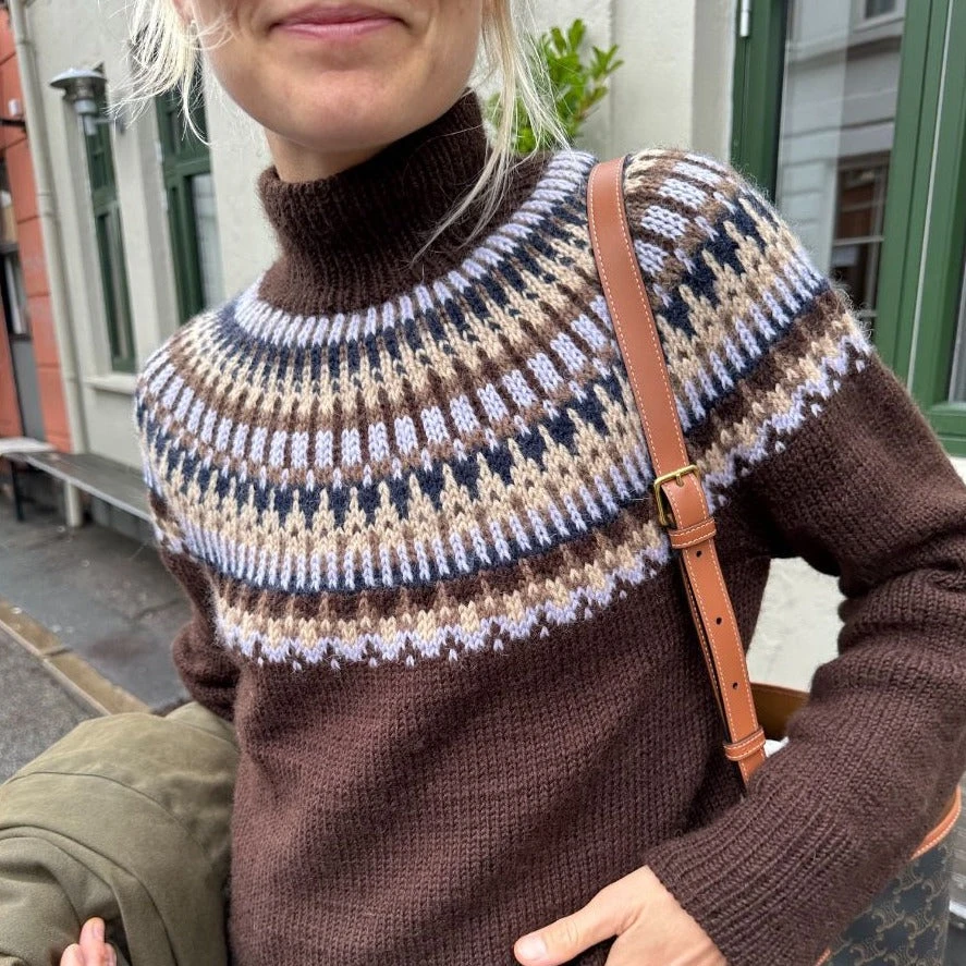 The Celeste Sweater is worked from the top down and has a circular yoke. First the neck edge is worked, then the yoke is worked in the round in the charted colorwork pattern using 5 different colors. Short rows are worked after the stranded pattern has been completed to raise the back and create a nice fit. The body and sleeves are worked in the round in stockinette stitch and finished with a rib edge.