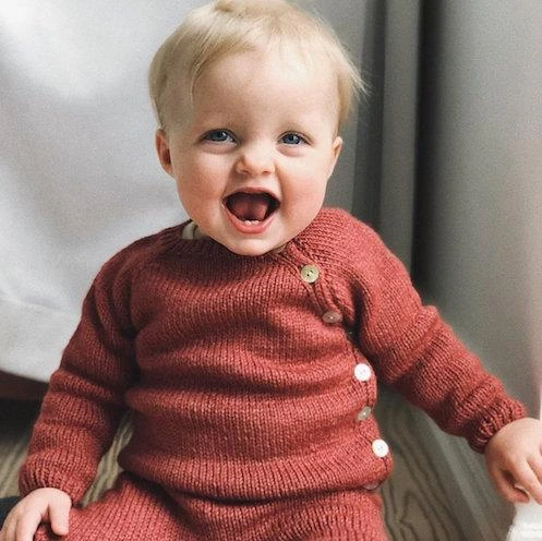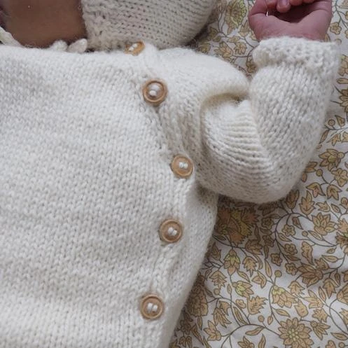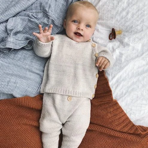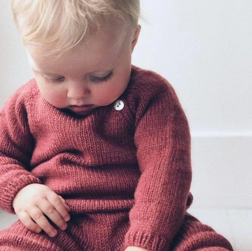The top is a wrap-style jacket, worked back and forth top-down. It is closed with summarys along the left side. The summary bands consist of 5 sts of rib and are worked in one piece with the jacket, so you do not have to pick up sts at the end. The pants are worked top-down and shaped with short rows in the back. The bonnet is worked first back and forth from the front towards the crown. The crown is worked in the round on double pointed needles and shaped with decreases. Then, sts are picked up along the neck border to work rib edge and lastly a tie is attached at the front.