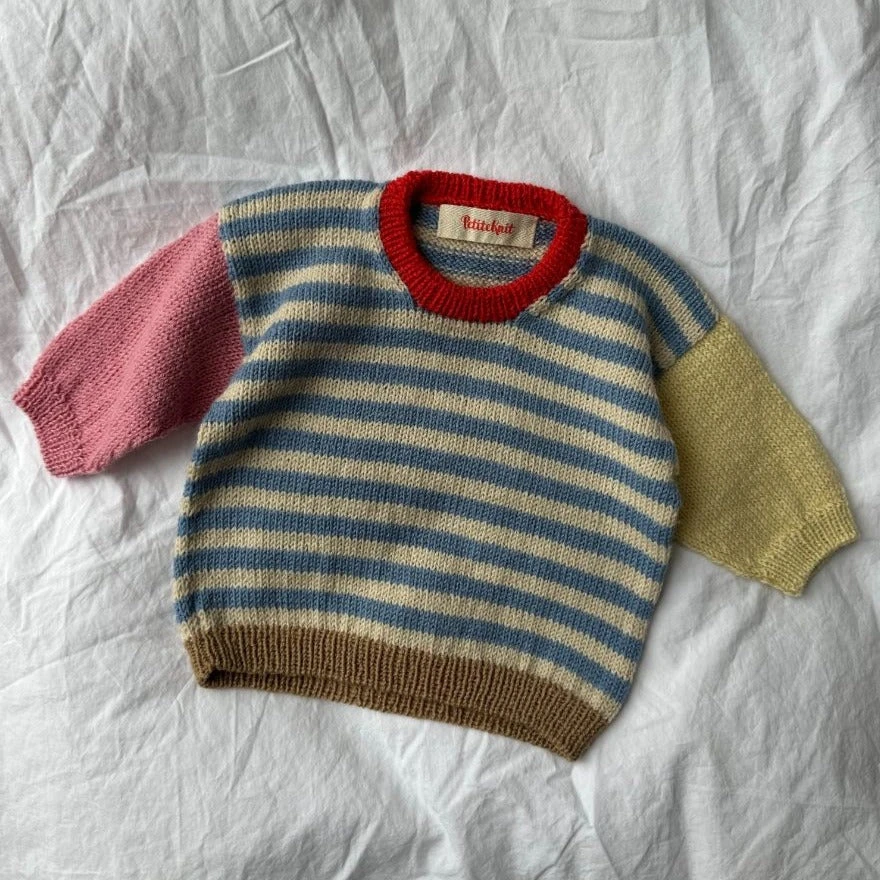 The sweater is worked from the top down. The body is worked in stockinette stitch with stripes, while the sleeves and neck edge are each worked in a different solid color. First, the back yoke is worked, then each shoulder is worked back and forth on a circular needle. The shoulders are then joined to form the front yoke. The front and back yoke are joined at the underarms to form the body, which is worked in the round on a circular needle. The sleeves are worked down from stitches that are picked up and knitted around the armholes. At the end a folded neck edge is worked from stitches that are picked up and knitted along the neckline.