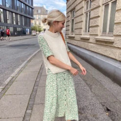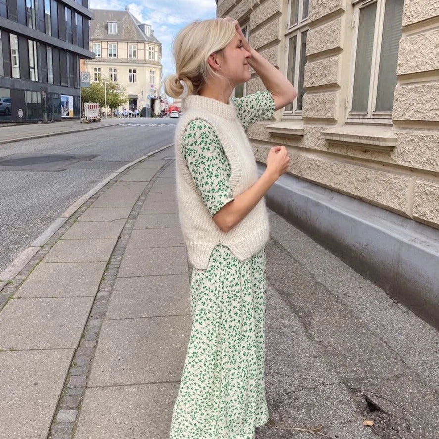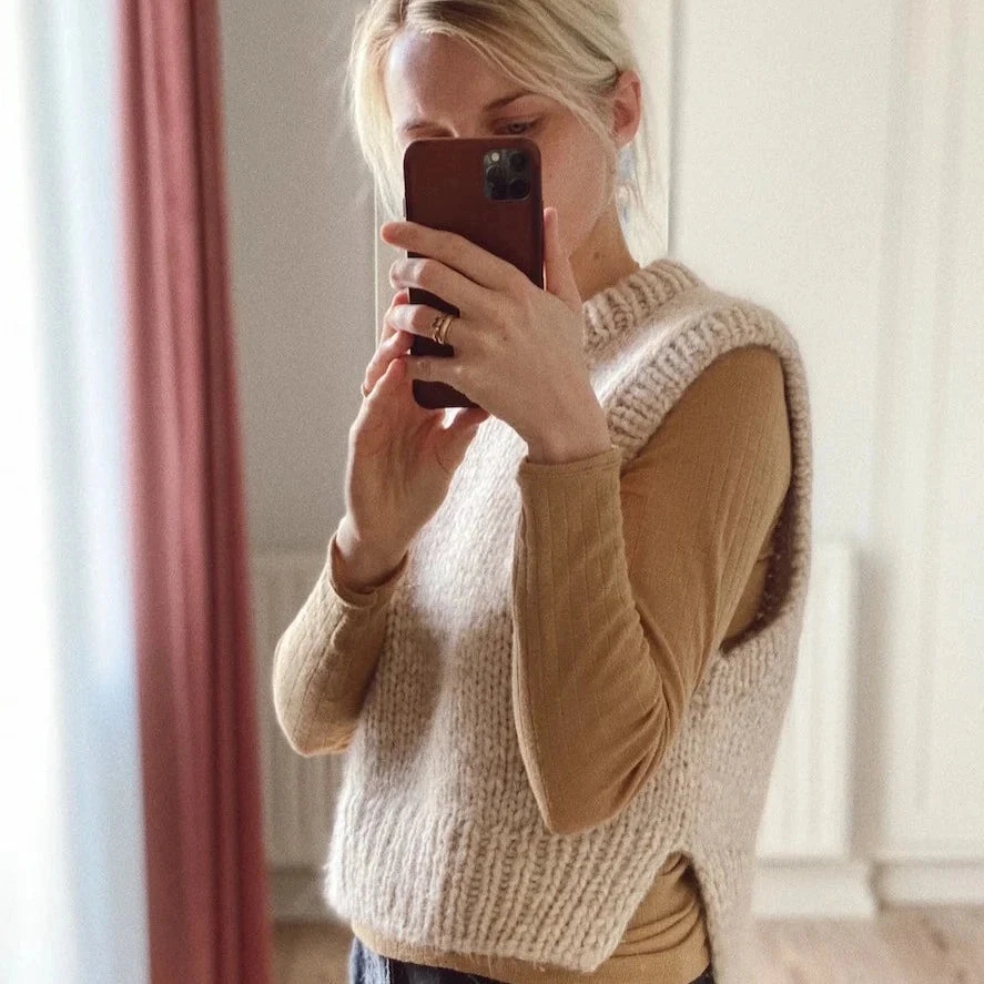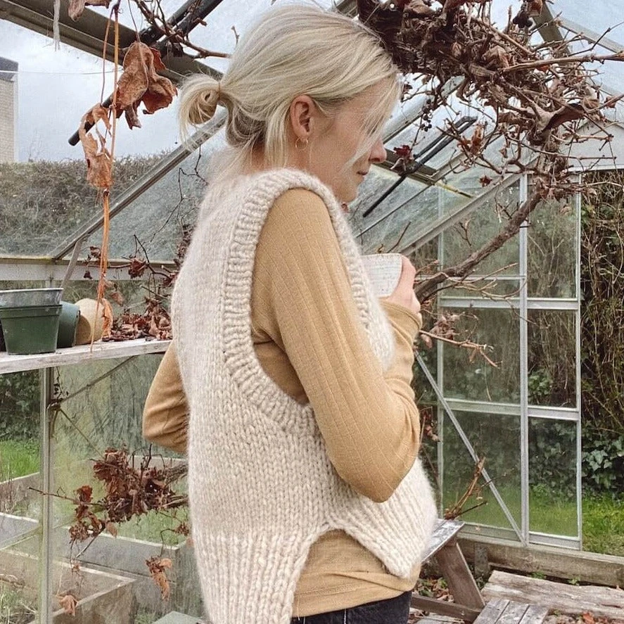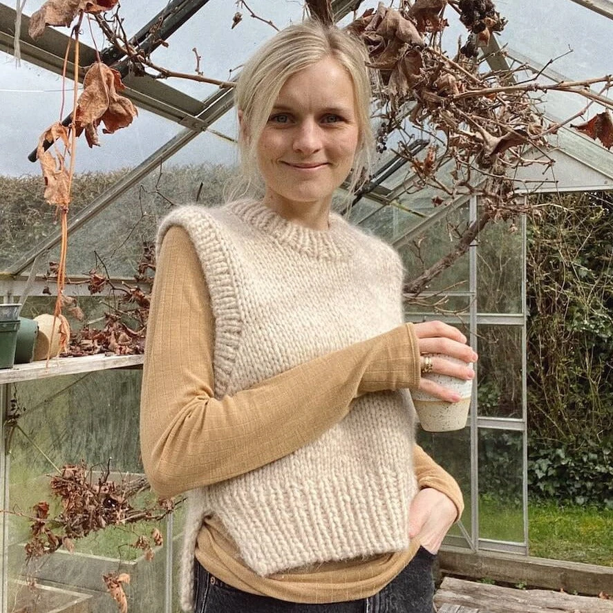The Holiday Slipover is a chunky slipover with deep armholes. It is worked from the top down in stockinette stitch. First the back of the yoke is worked, then the shoulders, then the front of the yoke and finally the body. A split rib edge where the back section is worked a bit longer than the front section is worked at the hem. Rib edges are worked at the neck edge and along the armholes at the end, and finished with an Italian cast-off for a neat and lovely finish.