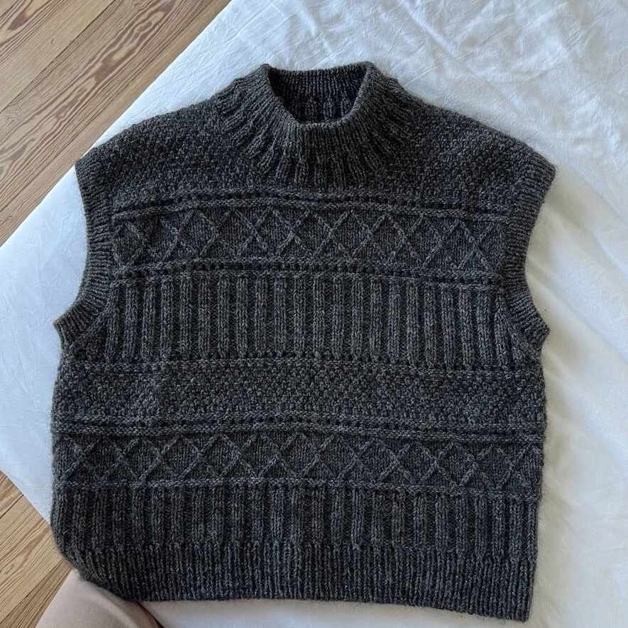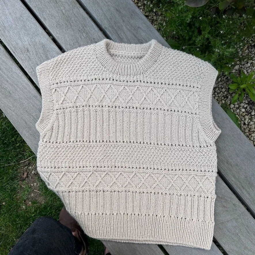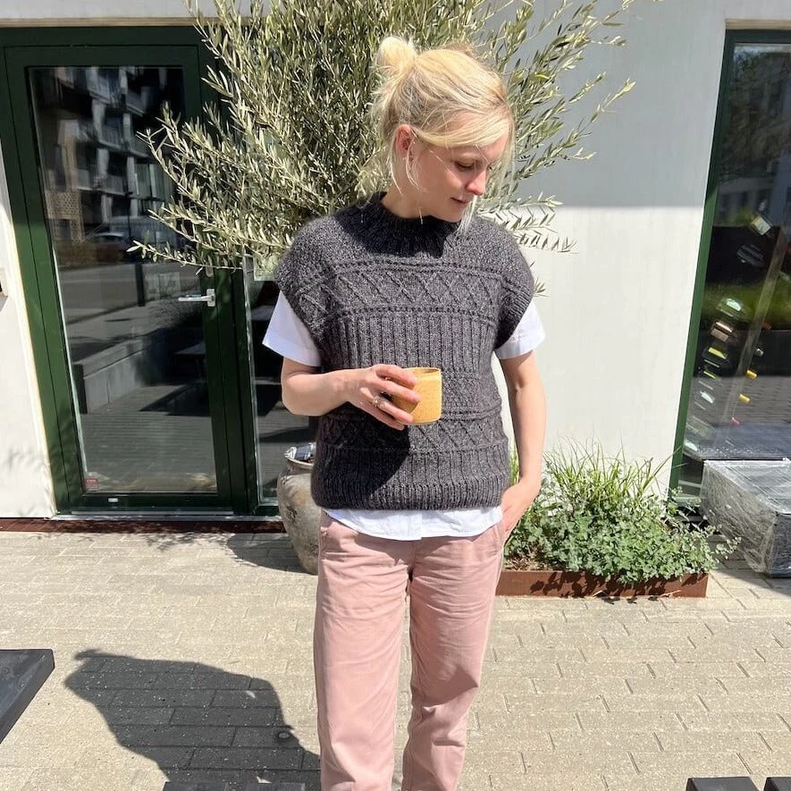 The Ingrid Slipover is worked from the top down in a knit and purl texture pattern. First, the back yoke is worked back and forth and the sloping shoulders are shaped using short rows. Then stitches are picked up and knitted for the shoulders, which are worked separately and then joined to form the front yoke. The front and back yoke are joined at the underarms to form the body, which is worked straight down in the round. Rib edges are worked along the armhole openings and at the neck. The Ingrid Slipover is worked in a texture pattern, which consists of three different pattern sections, each one separated by an eyelet section.