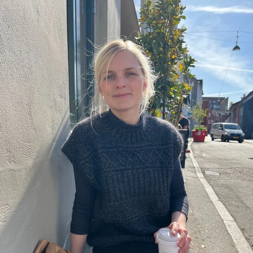 The dark Ingrid Slipover is knitted in Jensen by Isager the color 4S held together with Silk Mohair by Isager in the color 30.