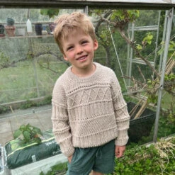 The Ingrid Sweater Junior is worked from the top down in a knit and purl texture pattern. First, the back yoke is worked back and forth and the sloping shoulders are shaped using short rows. Then stitches are picked up and knitted for the shoulder sections, which are worked separately and then joined to form the front yoke. The front and back yoke are joined at the underarms to form the body, which is worked straight down in the round. The sleeves are knitted in the round from stitches that are picked up and knitted along the armholes. A rib neck edge is worked, folded double and knitted together. The Ingrid Sweater Junior is worked in a texture pattern, which consists of three different pattern sections, each one separated by an eyelet section.