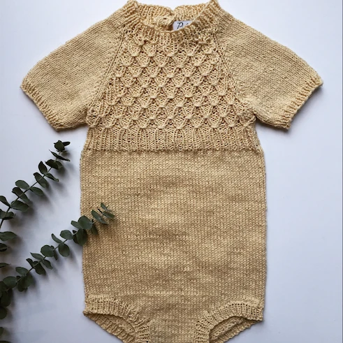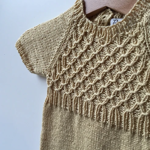 Milla’s Summer Suit is inspired by the 1950’s knits for kids, where the yoke was often worked in smocking st. The suit can easily be worn with leggings and a knit cardigan. Milla’s Summer Suit is worked bottom up and the fit is snug.