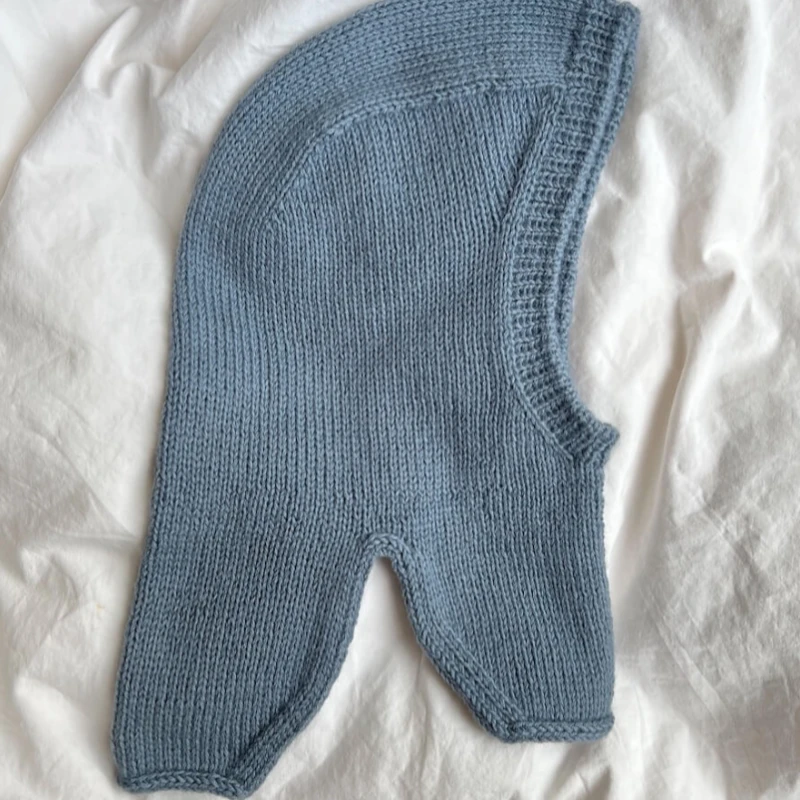 The Monday Balaclava is worked from the top down in stockinette stitch. First a square is worked for the top of the head. Then stitches are picked up and knitted along both sides of the square and decreases are worked along the opening for the face. The balaclava is then worked straight down and then joined to be worked in the round below the chin before it is split into front and back. At the end a rib edge is worked along the face opening and an i-cord edge is worked along the bottom edge.