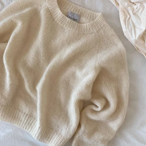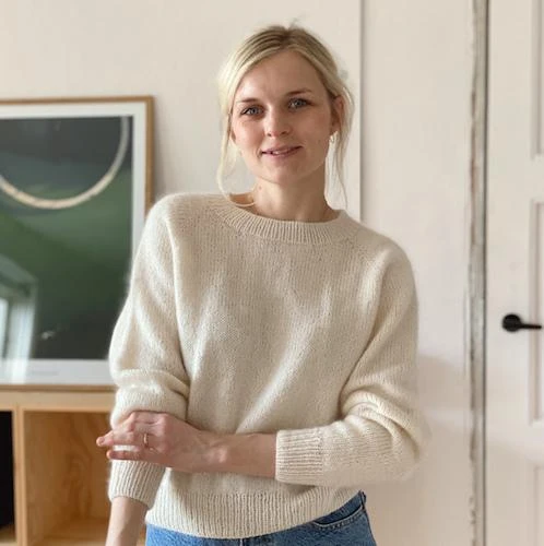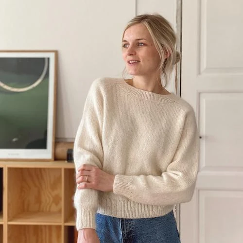 No Frills Sweater is a simple raglan sweater with a lower neck opening in the front. The fit is a little oversized but a wide rib on the sleeves and around the waist gives it a feminine look. The simple design of the sweater lets you experiment with color. No Frills Sweater is worked top-down and you can therefore easily try on the sweater as you go to achieve the perfect length of sleeves and body for you. The length measurements in the pattern are standard measurements and merely a guideline. Depending on the choice of yarn the sweater will get bigger as you use it. If you want to keep the neck opening tight you can sew a thin elastic on the inside of the neck rib.