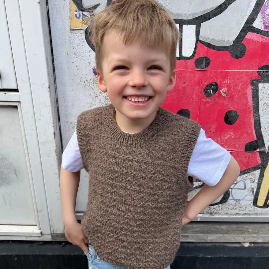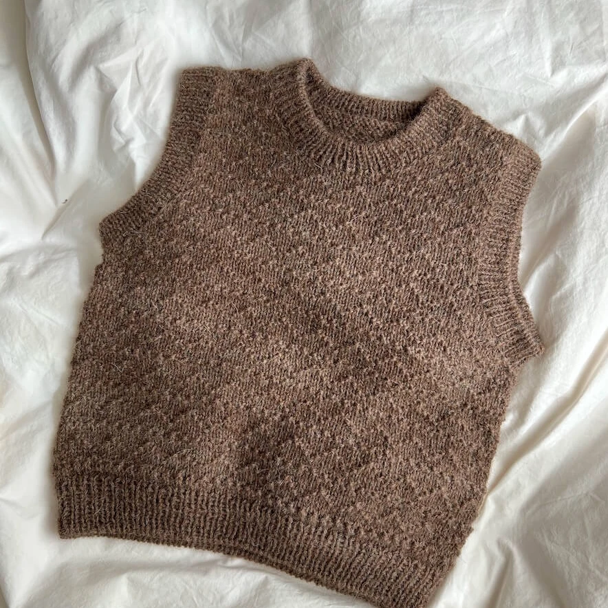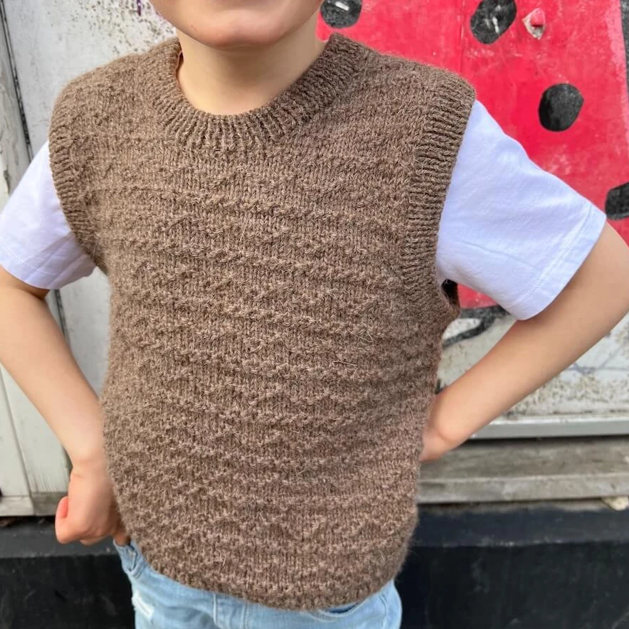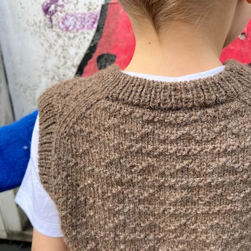 The Sille Slipover Mini is worked from the top down in a knit and purl structure pattern. First the back yoke is worked, then the shoulders, and then the front yoke are worked flat. After this, the front and back yoke are joined and the body is worked in the round, and finally rib edges are worked along the neck and armhole openings. Begin by knitting a swatch to determine which needle size you need to achieve the correct gauge before starting the project.