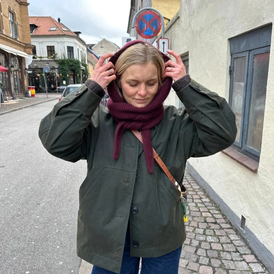 Sophie Hood is knitted back and forth in one piece in garter stitch with i-cord edges from tip to tip. The hood is shaped with increases and decreases, and it is sewn together with mattress stitches at the neck at the end.