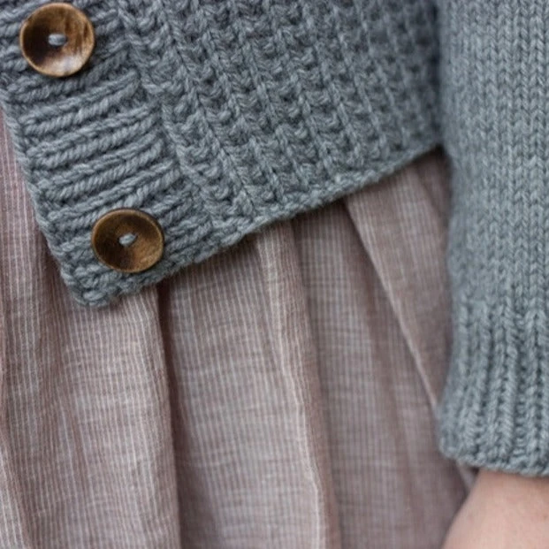 Ramona cardigan has top-down raglan construction, a crew neck and slight waist shaping. It features a fake ‘seam’ along the sides, giving the appearance of a seam as well as providing a little more structure than a typical seamless sweater. Slightly cropped and well-fitted, this cardigan is a quick and easy knit. Detailed pattern instructions make this a perfect ‘first sweater’ project for the beginner knitter. More advanced knitters will also enjoy the pattern as a relaxing knit.