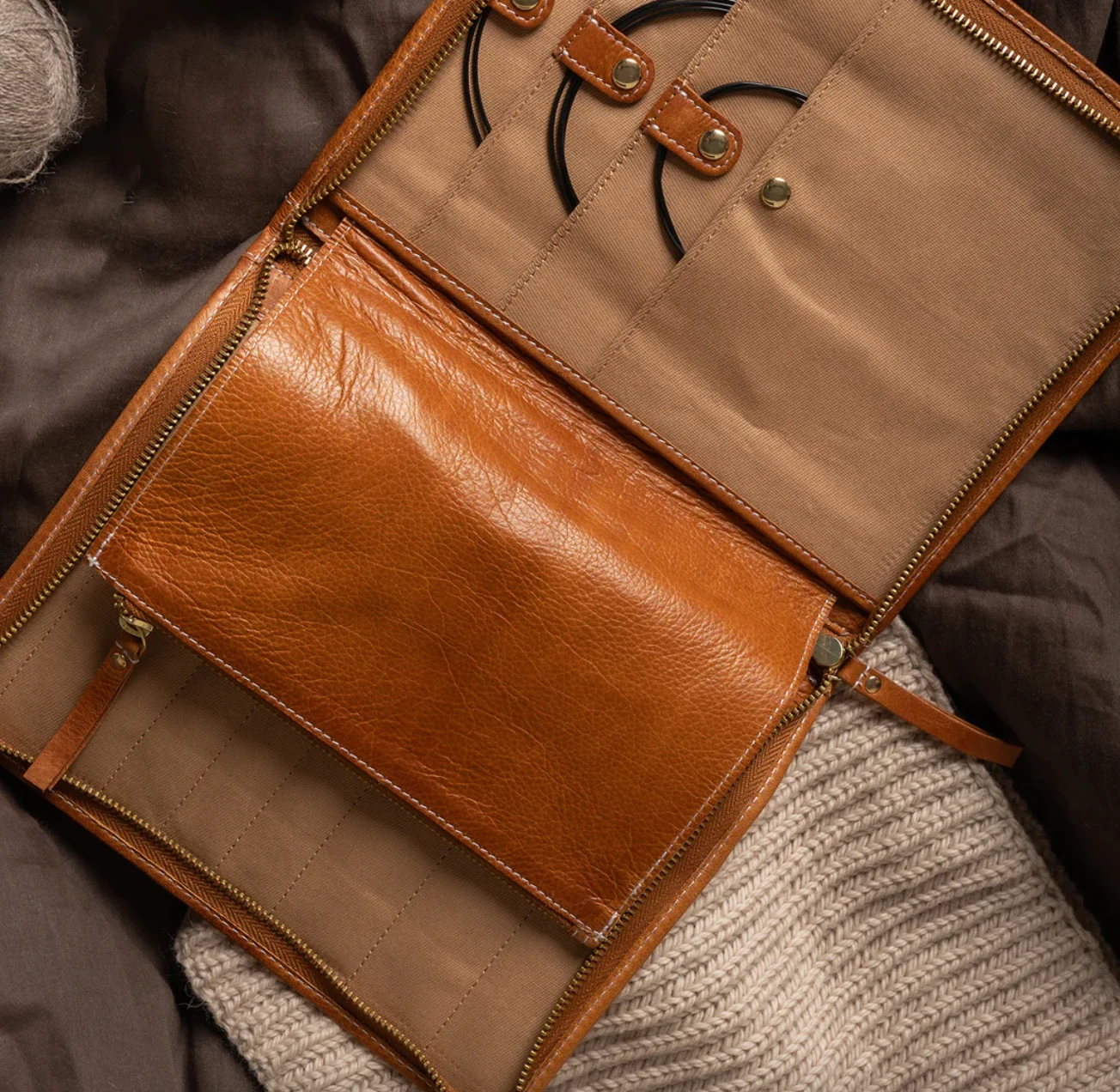 Perfect for any experienced knitter, this stylish and practical case features a leather zip compartment, wire pockets, and needle tip pockets, all secured by a chic golden metal zipper. With PROJECT 8, you can say goodbye to needle chaos and hello to effortless knitting bliss. Made from premium quality cow leather, each case is naturally coloured and treated with dye to preserve its unique, raw appearance and soft feel. After dyeing, a light wax is carefully applied by hand for an extra touch of luxury.