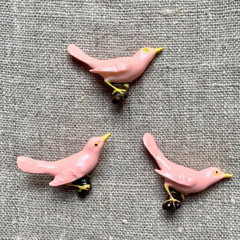 A super sweet bird summary made of resin. There’s a shank on the back for sewing but we think it would also make a very pretty decorative brooch. Or you could sew it on your garment but then use snaps behind it.